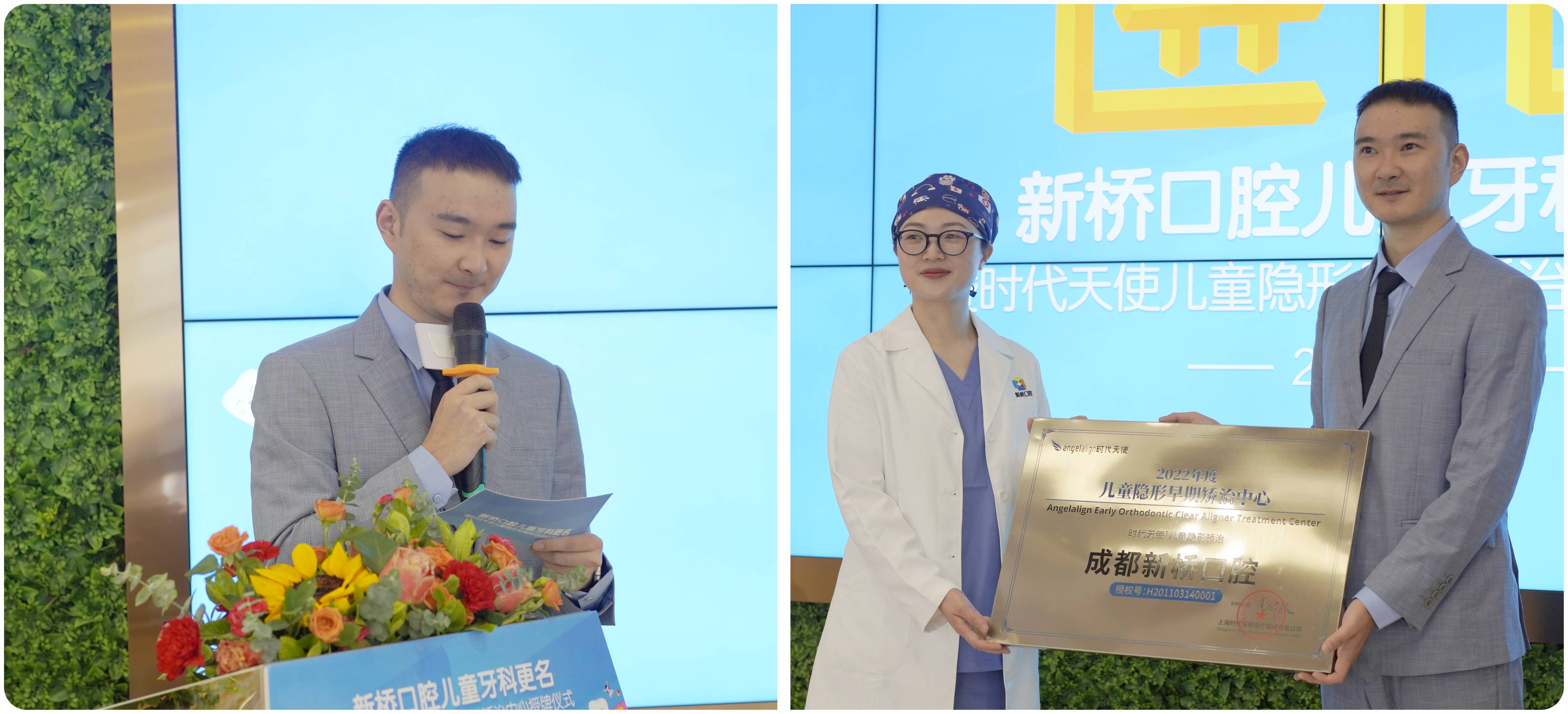 更名儀式現(xiàn)場,時(shí)代天使KID華西區(qū)運(yùn)營經(jīng)理許鳴先生向新橋口腔授予了西南首家“兒童隱形早期矯治中心”稱號(hào),這也是新橋口腔兒童早期矯正??瞥闪⒑螳@得的首個(gè)榮譽(yù)。