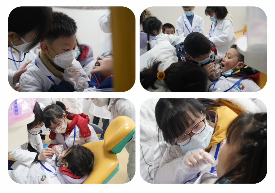 學(xué)習(xí)完畢,進(jìn)入闖關(guān)任務(wù)“體驗(yàn)室勇氣挑戰(zhàn)”。小牙醫(yī)們正式上崗,為自己的小伙伴兒做口腔檢查。“初入職場(chǎng)”的他們沒(méi)有一絲膽怯,“你有小黑牙喲”、“你要勤刷牙哦”......實(shí)踐起來(lái)的他們有模有樣。