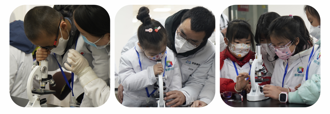 小朋友們?cè)诳茖W(xué)家?guī)ьI(lǐng)下使用顯微鏡
