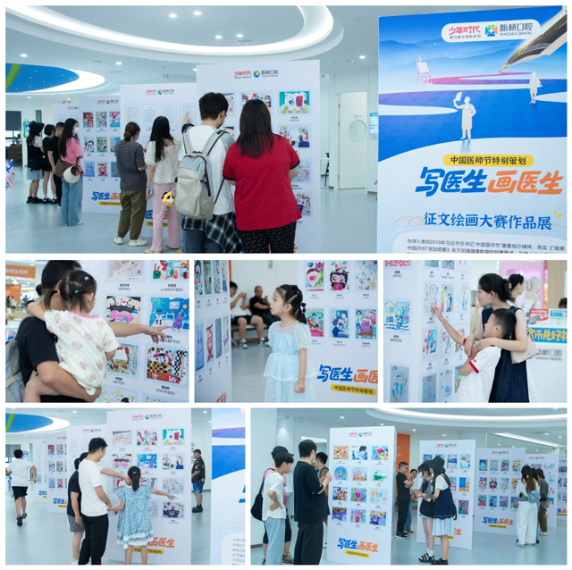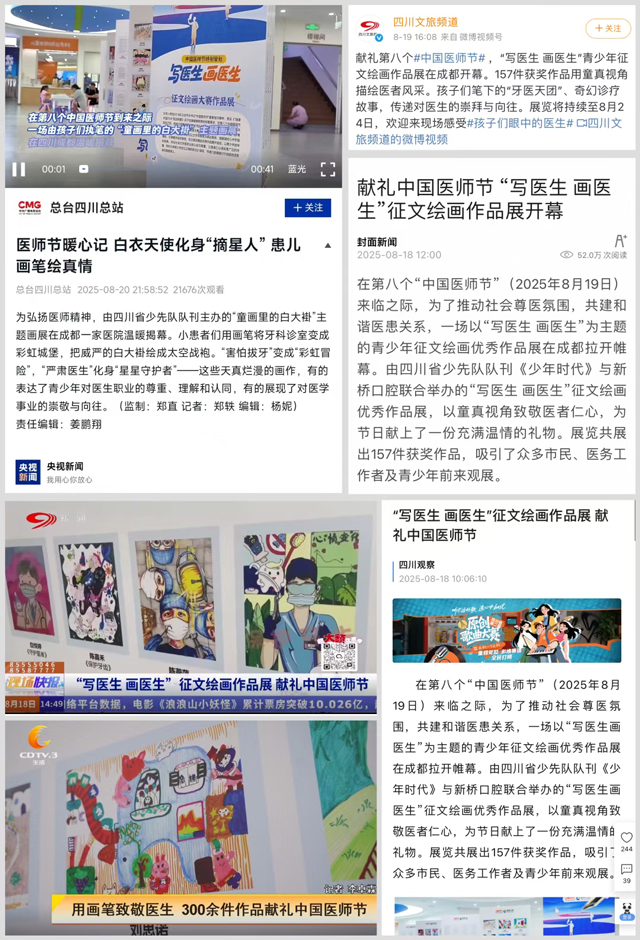 同期舉辦的“寫(xiě)醫(yī)生 畫(huà)醫(yī)生”征文繪畫(huà)大賽,則是一次藝術(shù)與健康的創(chuàng)新融合。通過(guò)孩子們獨(dú)特的視角和筆觸,記錄他們對(duì)醫(yī)生職業(yè)的觀察與理解,在傳遞醫(yī)者仁心的同時(shí),引導(dǎo)青少年樹(shù)立正向的職業(yè)觀。大賽遴選的157件優(yōu)秀作品,在第八個(gè)中國(guó)醫(yī)師節(jié)前夕于新橋口腔成都總院悉數(shù)展出,為白衣天使獻(xiàn)上溫情禮贊。值得一提的是,該展覽獲央視新聞重點(diǎn)關(guān)注和刊載報(bào)道,四川電視臺(tái)、成都電視臺(tái)、封面新聞、四川觀察等主流媒體共同傳播,讓這份童真獻(xiàn)禮溫暖傳遞,掀起致敬醫(yī)者仁心的熱潮。