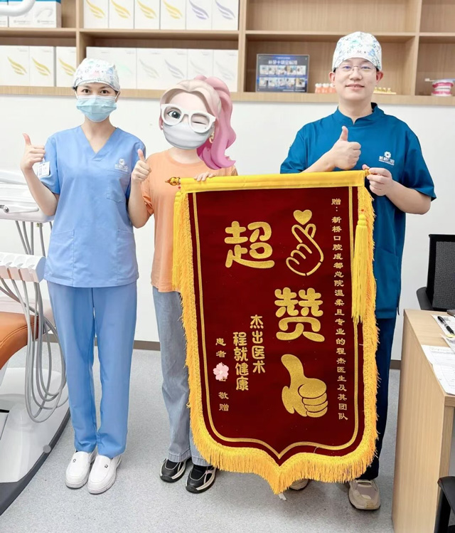 近日,新橋口腔成都總院(成都人南新橋口腔醫(yī)院)種植專科程杰醫(yī)生收到了一面格外吸睛的錦旗紅彤彤的緞面上,超贊兩個大字躍然眼前,下方金色大拇指高高豎起,旁邊還有一個溫暖的比心手勢,側(cè)旁一行稍小的標……