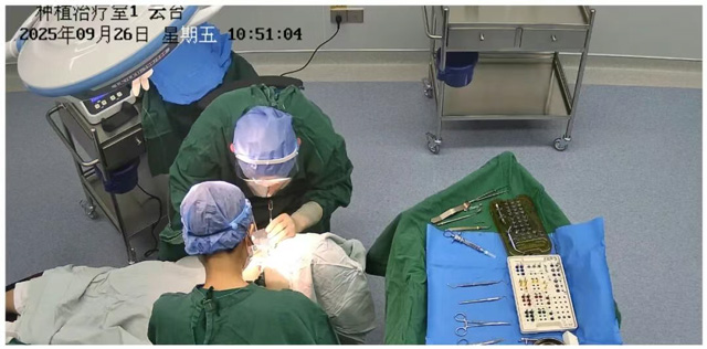 手術(shù)直播環(huán)節(jié),黃杰主任在高清鏡頭下完整展示了種植體植入的全過程。手術(shù)出血少、創(chuàng)傷小、顧客配合良好,整個(gè)流程順暢高效,充分展現(xiàn)了數(shù)字化種植技術(shù)的精準(zhǔn)與微創(chuàng)優(yōu)勢。