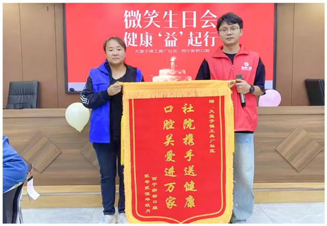活動尾聲,在全體人員齊唱生日歌、共送祝福的溫馨氛圍中,西寧新橋口腔向工具廠社區(qū)贈送了印有“社院攜手送健康,口腔關(guān)愛進萬家”的錦旗,以此感謝社區(qū)對公益健康事業(yè)的大力支持與緊密協(xié)作。