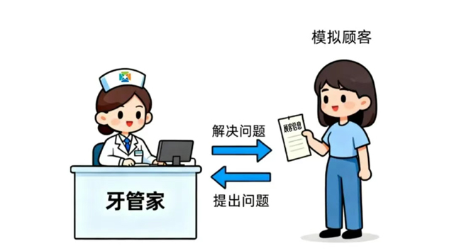 本次競賽突破傳統(tǒng)技能比賽框架,打造獨(dú)特考核機(jī)制。各院區(qū)派出的2人小組在比賽當(dāng)日承擔(dān)不同角色:一人作為牙管家參賽,需接待由其他院區(qū)同事扮演的“模擬顧客”,應(yīng)對各種問題,完成全流程服務(wù);另一人則化身“模擬顧客”,前往抽取到的牙管家席位,為參賽牙管家制造各類難題,以此全面檢驗(yàn)牙管家的專業(yè)知識面、業(yè)務(wù)能力、靈活性以及抗壓能力。