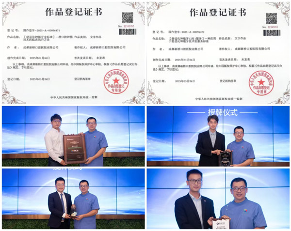 為確保該體系的標(biāo)準(zhǔn)化與高品質(zhì),新橋口腔制定并統(tǒng)一執(zhí)行《舒適化種植牙金標(biāo)準(zhǔn)》與《舒適化種植牙12對(duì)1品質(zhì)服務(wù)》標(biāo)準(zhǔn),且于2025年3月獲國(guó)家著作權(quán)認(rèn)證。這一系列獨(dú)家標(biāo)準(zhǔn)也獲得瑞士士卓曼、德國(guó)貝格等國(guó)際知名植體品牌的聯(lián)合認(rèn)可,并授予我院舒適化種植臨床合作示范基地稱(chēng)號(hào)。