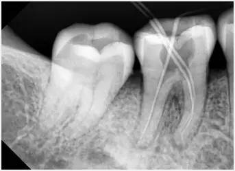 應(yīng)用平行投照X線方法、根管長度測量儀確定根管度,最好插針拍X片。